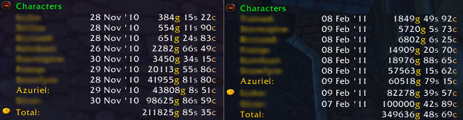 Tragically, I only downloaded MySales in the past few weeks so I don’t have as much hard data as I would have enjoyed browsing. Generally speaking though, I do not pool the gold across my various toons as you can see; by keeping it separated, it gives me a way of judging how profitable and/or self-sustaining certain individual professions can be.