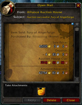 In any case, when choosing your price, the important thing is not chosing a price based on what you would consider a good return on the “initial investment.” That term is in air quotes because (presumably) you did not buy the item for its investment properties, but rather for your own future use. Rather, choose a price at which you would feel good about losing the future utility of the item. This isn’t about opportunity cost, this is about pricing items that you had not planned on selling at all. Angerforge at 28.5k was at the upper end of the bang-for-my-buck scale. Flipping it for 35,000g might have been a reasonable return for some people, but an anemic 19% return on five-digit investment is not good enough for me. Nearly double that percentage though? Now we’re talking.