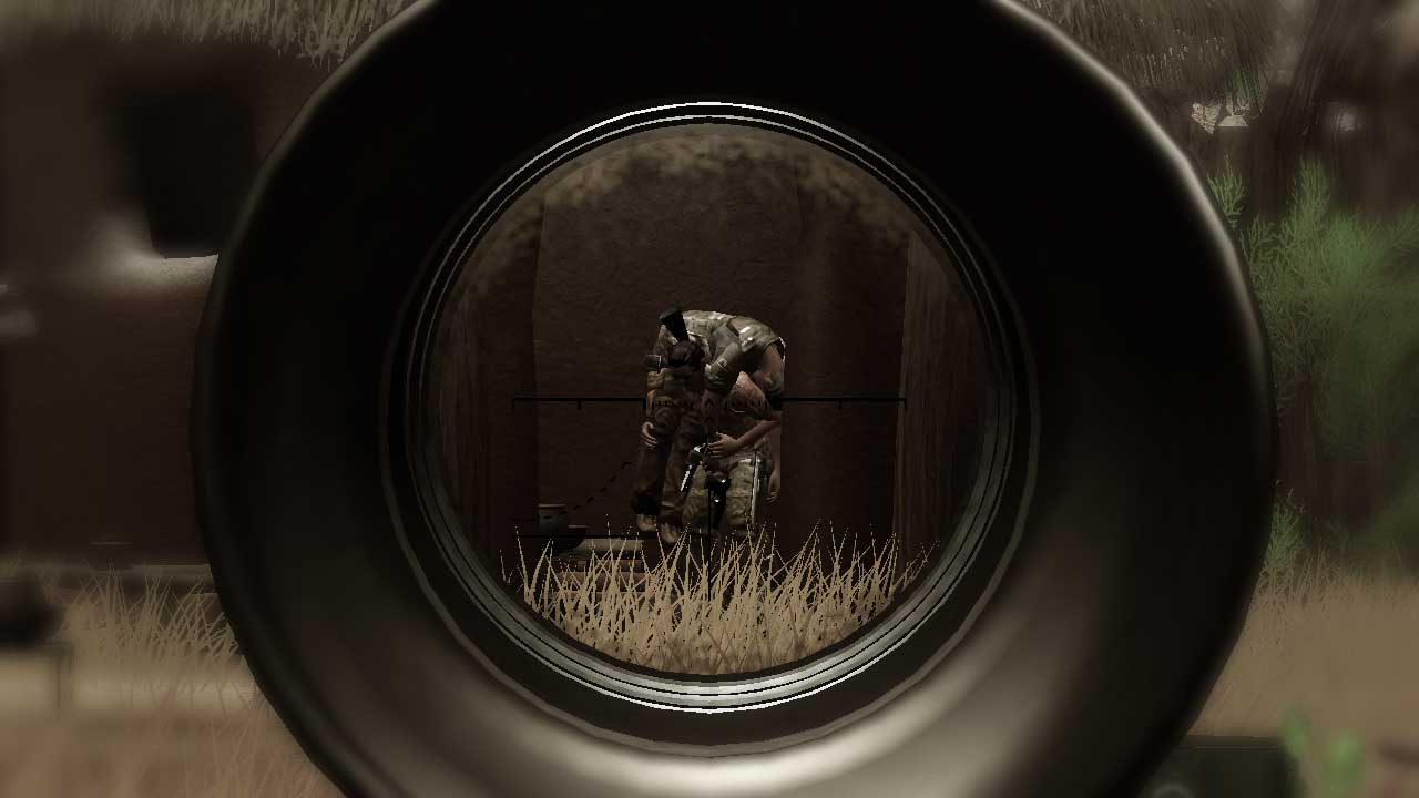 One of the more ballsy moves on the designers’ parts was having crosshairs disabled by default. In fact, generally speaking, there is no HUD at all until you reload or take damage. This definitely gives Far Cry 2 a more primal feel as opposed to arcade shooter, even though you look down iron sights most of the time. Reinforcing this primacy are little touches like how “health kits” are morphine ampules injected into your wrist veins. Indeed, if you are close to death, “healing” becomes pulling bullets out of your arm with needle-nose pliers, yanking your wrist/elbow/shoulder back into their sockets, cutting shrapnel out of your leg with a knife or extracting pieces of rebar out of your thigh. If you recruit a combat buddy, they can even swoop in when your health reaches zero to save you from a hard Game Over, in an extended sequence of dragging your semi-conscious form to cover before stabilizing you. All this happens wherever you are, not some stock footage, and that combat buddy will still be there helping shoot the enemies that (almost) took you out. If they go down, you have the option of returning the favor by stabilizing them, or putting them out of their misery with a coup de grace.