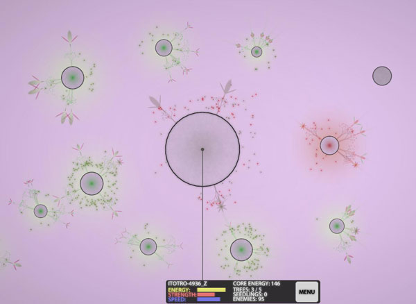 Eufloria is an ambient indie strategy/puzzle game that blurs the line between strategic depth and shallowness. Your goal is to colonize all the asteroids in the playing field using your fleet of organic plant ships called Seedlings. Each asteroid has three characteristics – Strength, Speed, and Energy – and their varying levels determines the qualities of the resulting Seedlings that are grown from the Dyson trees. You see, to control of an uninhabited asteroid, you essentially sacrifice 10 of your Seedlings to grow a Dyson tree, which makes more Seedlings indefinitely. If said asteroid is inhabited by the enemy, your forces must attack any enemy Seedlings there, blow up one of their Dyson trees, and then kamikaze themselves through the root system to sap the core. Once the core is sapped, the asteroid is yours and any surviving Dyson trees are automatically converted to your side.