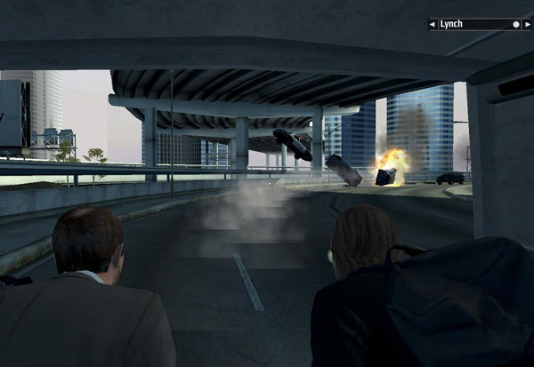 The game itself is an over-the-shoulder shooting spree as you navigate Kane through areas of cover and increasingly ridiculous scenarios. The7 has kidnapped your wife and daughter, and to get them back you rob a bank, escape by murdering half the police force in the western United States, fly (!) to Tokyo, fly (!!) back to the US, kill some more people, fly (!!!) back to Tokyo, and fly (!!?!) back to the US and other locales, as if there is no such thing as a no-fly list in the year two thousand and goddamn seven.