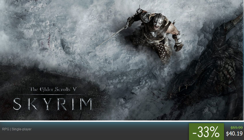 Posted on December 24, 2011, in Miscellany and tagged Skyrim, Steam. Bookmark the permalink. Comments Off on Skyrim 33% Off on Steam.