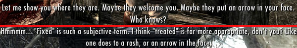 Posted on February 17, 2012, in Miscellany and tagged Horrific Arrow Wound, Skyrim. Bookmark the permalink. 3 Comments.