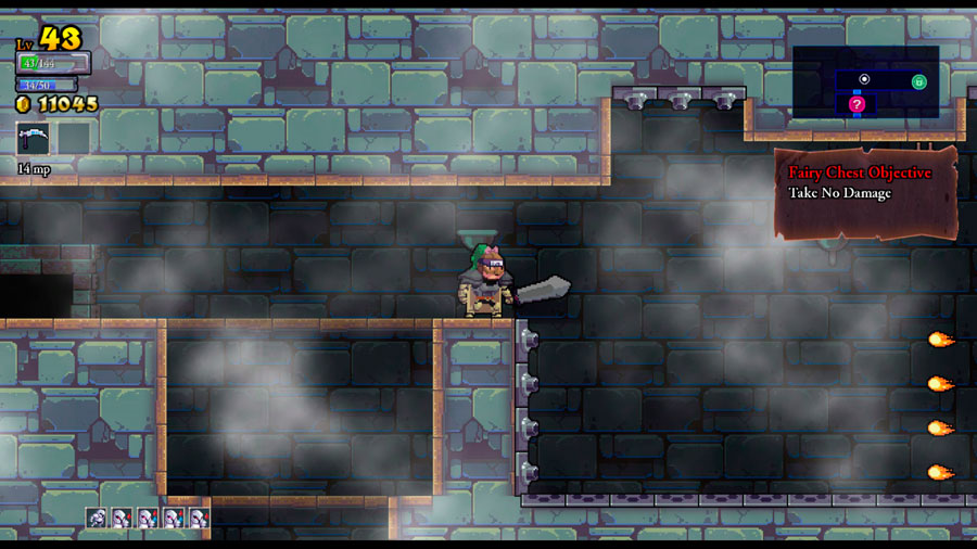 The gameplay itself is pretty unforgiving. While you can equip a bunch of Vampiric gear later on, and occasionally find a piece of health-restoring food when destroying furniture, for the most part damage you take is permanent. This can lead to frustrating scenarios in which an otherwise solid-looking boss attempt is stymied on the way to the door because you landed on some spikes in the prior room. Or misjudged a screen full of projectiles. Or faced one of those goddamn wolves that seem to charge half a second earlier than you’re prepared for.