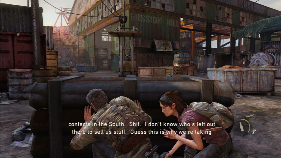 The Last of Us (TLoU) is 3rd-person, stealth-emphasized cover-based shooter set twenty years into a “zombie” post-apocalypse. An outbreak of mind-destroying spores has nearly wiped out humanity, and the survivors are doing their best to stay alive in a world of infected bites, raiders, and mundane starvation. You play as Joel, a professional smuggler and hardened badass, who along with your partner Tess is looking to get even with a guy who robbed you both of a shipment of guns. After a series of close calls, Joel & Tess take up one last job: to smuggle a 14-year old girl out of the city and to a safe house.