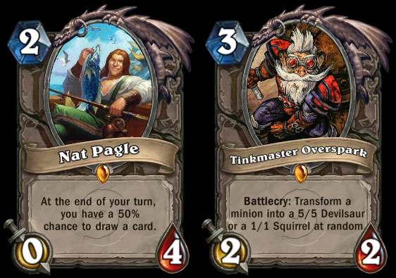 When it comes to Nat Pagle specifically, I do sorta agree with the detractors: it’s a boring card. I have one, and it’s a no-brainer card that goes into just about every deck. Worst case scenario, Pagle draws nothing and is a 2-mana 0/4 taunt that trades with removal. Best case? It’s ridiculous. Indeed, it reminds me of the “good design on paper, bad design in practice” card Fact or Fiction in Magic: the Gathering. There was never any reason to not use it in every deck that could support the mana cost – so much so, that it was banned/restricted in the older formats for over nine years.