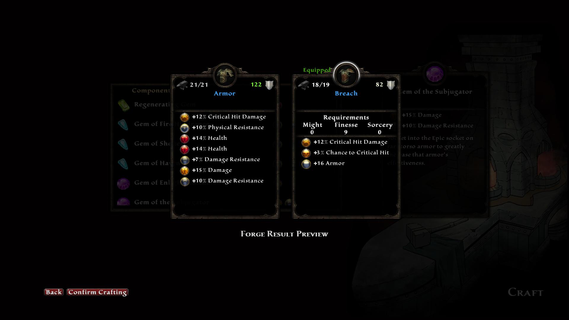 Just so we have it in text form, my equipped gear was 82 Armor, +12% crit damage, and +3% crit chance. Meanwhile, my crafted gear is 122 Armor, +12% crit damage, +28% Health, +17% Damage Resistance, +10% Physical Resistance, and +15% Damage. I don’t even remember at which level I crafted that piece of armor, but I basically never equipped anything else until the end of the game. Which meant 100% of the armor drops I received from then until the end were vendor trash. Which meant my motivation for actually completing these quests and/or acquiring more gold dropped to zero.