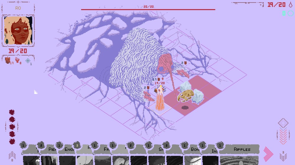 The general gameplay is you moving Ro around the spirt-world landscape in a click-to-move way, collecting resources laying around, and then encountering the outline of a grid near some static enemies. Cross the grid and you will see the claustrophobic fighting arena, which enemies are present, and any special terrain. At this point, you can exit the battle without penalty. Choosing a starting square (based on which direction you came from) will begin combat.