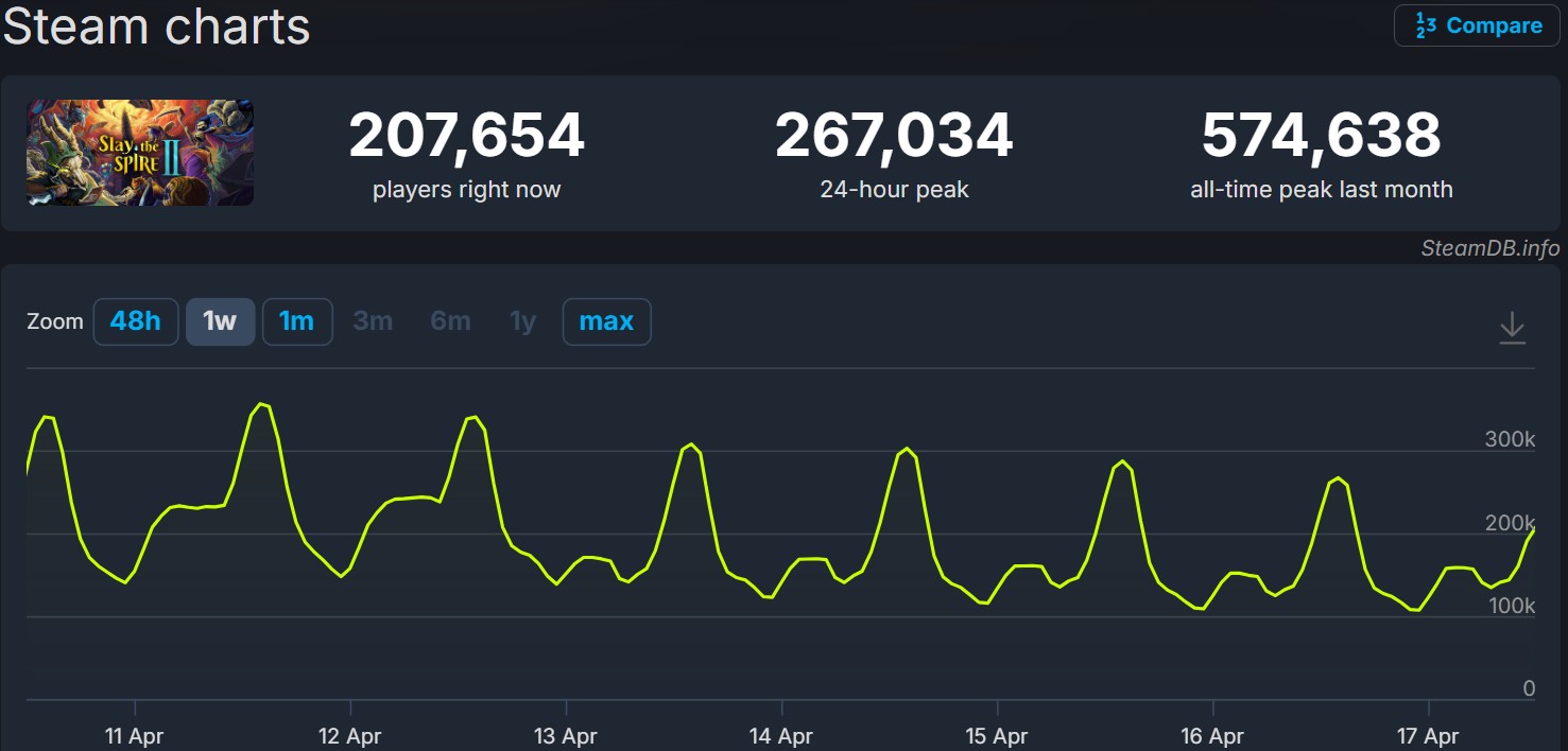 Incidentally, many people apparently agree. There are reports that Slay the Spire 2 has sold over 5 million copies while still posting some respectable concurrent Steam numbers:
