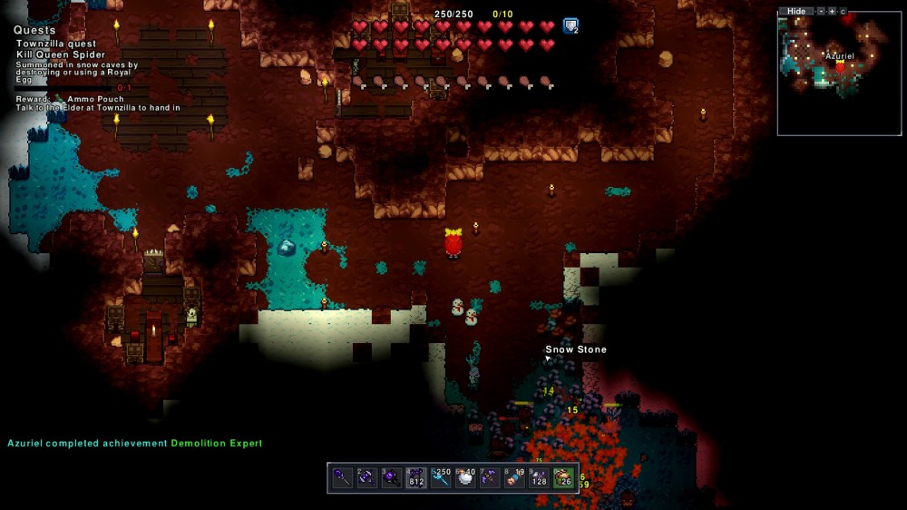 In Necesse, there is a large overworld with various creatures and hazards and biomes to explore. Additionally, there is an underground “layer” full of much more dangerous monsters and random loot. The loose goal is for you to summon bosses using specific item drops, defeat them, and use the resulting drops to unlock the next tier of progression. As you might expect with the top-down perspective, most of the bosses are bullet-hell style affairs with multiple phases.