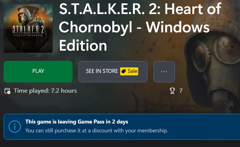 Stalker 2 is leaving Game Pass in a few days. Which means I should probably play a bit of it, eh?