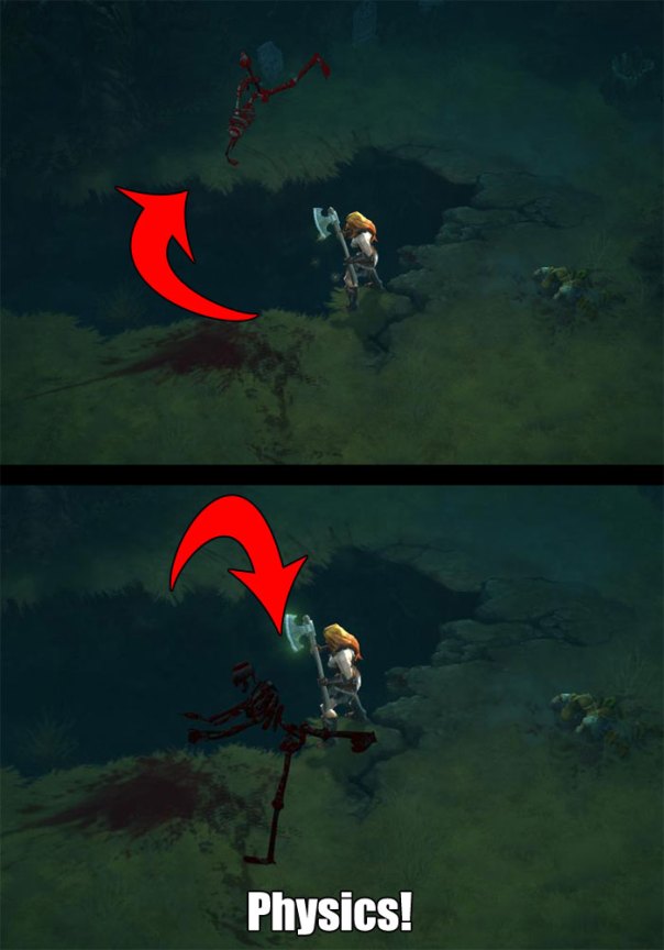 You could replace your generic attack button in Diablo 2 with a spell, of course. The trivializing of weapons in Diablo 3 though, is a sign of a deeper, systemic design shift. It reduces the weapon slot to just another generic item slot – reduction to a “stat stick” – and homogenizes all weapon drops into simply “can equip” and “can’t equip” categories. Should I dual-wield or carry around a 2H sword? It is an utterly meaningless distinction in Diablo 3; if weapon speed does impact ability use in some way, perhaps making it hit faster, it does so in a completely oblique fashion.