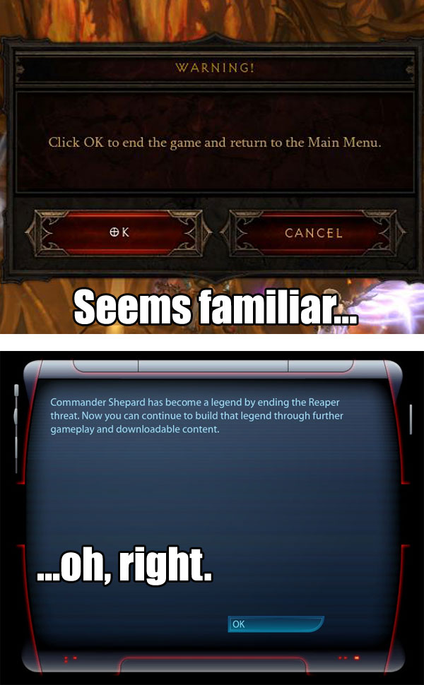 Neither the Diablo series¹ nor the hack-n-slash genre is exactly known for their compelling narratives, and that is fine. Campiness has its place, and that is fine too. But the shit Diablo 3 attempts to pull with a completely straight face is simply ridiculous, bordering on insulting. It feels like placeholder plot, especially in a severely truncated Act IV.