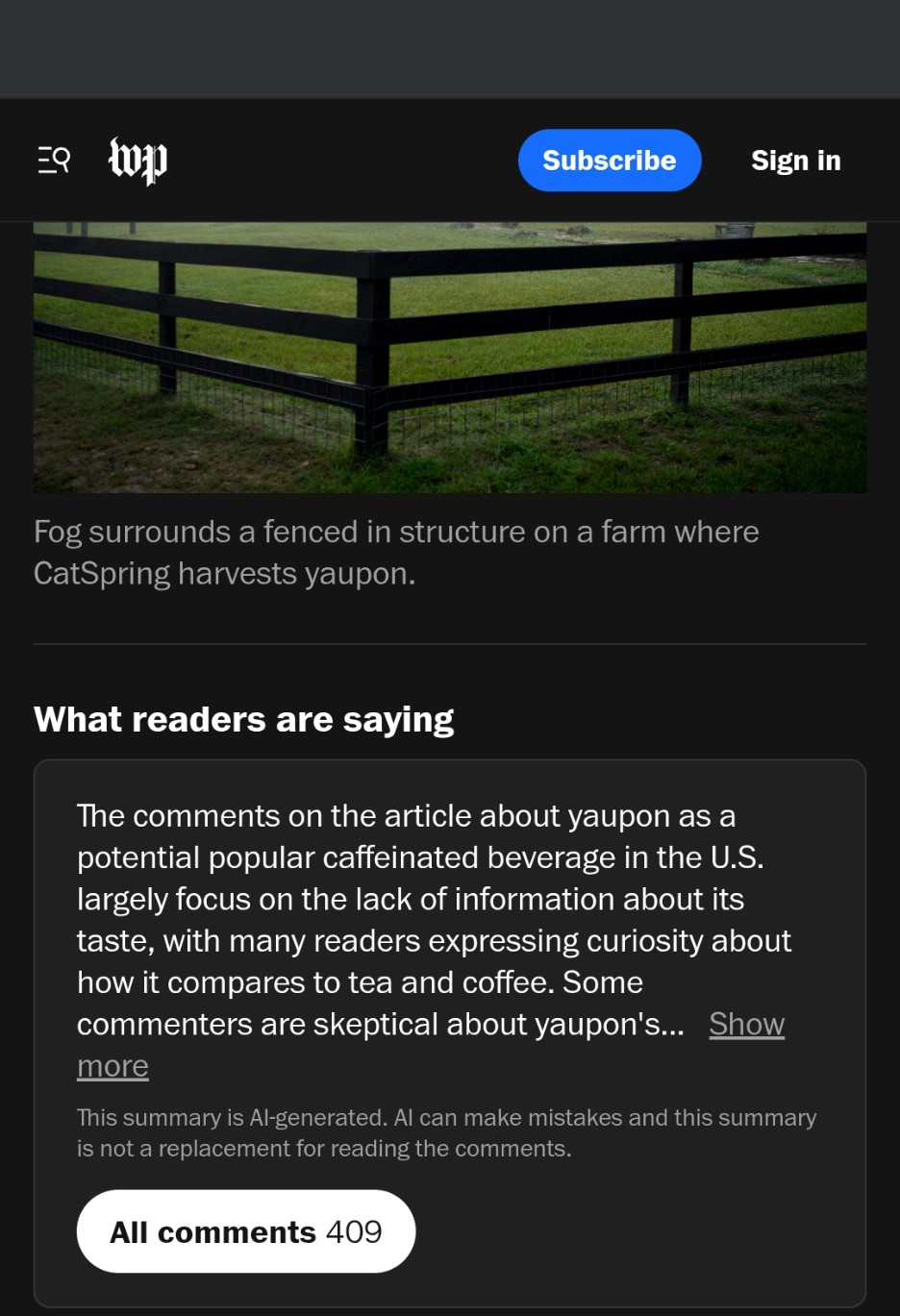 It’s long been known that the comments on news articles are trash: filled with bots or humans indistinguishable from bots. But there is something deeply… I don’t know a strong enough word for it. Cynical? Nihilistic? Absurd? Maybe just fucking comedic about inviting your (presumably) human readers to comment on a story and then just blending them all up in a great human slurry summary so no one has to actually read any of them. At what point do you not just cut out the middle(hu)man?