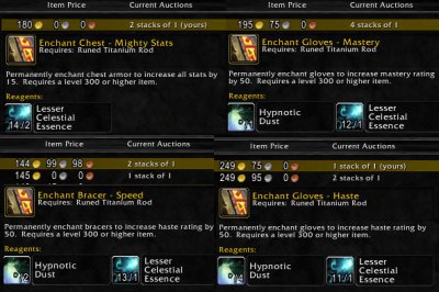 Pictured above is +15 Stats to chest for 180g, +50 Mastery to gloves for 195g, +50 Haste to bracers for 144g, and +50 Haste to gloves for 249g. These four are just a representative sample, not an exhaustive list, although Mighty Stats in particular is the de facto enchant for basically everyone. So unless Greater Celestial Essences are selling north of 270g apiece on your server, chances are that you can make a serious margin peddling bread and butter enchants that will always have a deep pool that consists of anyone who gets gear above ilevel 318.