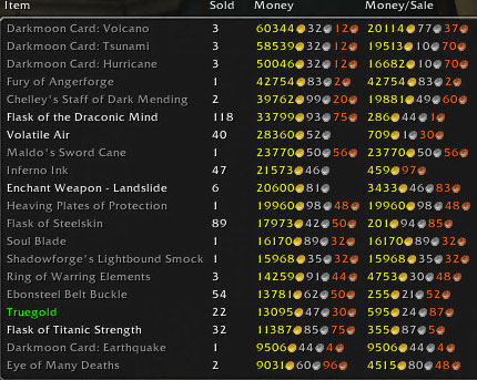 One thing that floored me right away was the Volatile Air. Obviously MySales does not differentiate stack sizes as it states I only sold “40” when I have basically been selling 13-16 Air stacks * 40, but damn. Hope you guys have been doing your daily transmute in Uldum on a regular basis! The Inferno Ink was another head-scratcher up until I realized that my average Volcano sale was 20,000g when that card has been below 10k for months now – in the heady days of the new expansion, I must have been pushing inks out like crazy. Oh, wait… I was. Finally, I am happy to see that the Maelstrom Gambit so far has been paying out some healthy dividends.