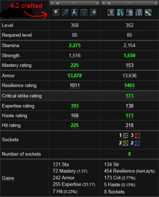 Note: the Difference column is focusing on the crafted gear. Looking at it in this perspective, Bloodthirsty Gladiator looks less obviously better. Indeed, the crafted gear has +146 stat points and +176 Stamina vs +108 Strength… and the existence of a metagem, a glove bonus, and a 4-piece bonus. Generally speaking, primary stats like Strength are valued at least 2:1 against combat ratings like Mastery, so the tradeoff becomes nearly ~2k HP against +3% crit damage and whatever goodies are on your gloves and 4pc bonus. Bloodthirsty Gladiator gear retains the advantage.