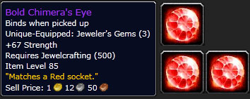 The stat bonuses from any one profession is around ~80 extra stats above what you could otherwise attain. As you can see from the pictures above, a Bold Chimera’s Eye grants +67 Strength vs a Bold Inferno Ruby with +40 Strength. (67 * 3) – (40 * 3) = 81. Mixology from Alchemy increases your flask strength by +80 stats, Synapse Springs gives a 480 stat bonus for 10 seconds every minute which is a ~16.66% uptime that averages into 80 stats, and the wrist enchants such as Major Strength were expressly added into the game to counteract imbalance that came with Leatherworkers having Embossments, such as +130 Strength, when everyone else had to settle for +50 Hit or +50 Haste (nevermind how much better primary stats already are from secondary ones this expansion).