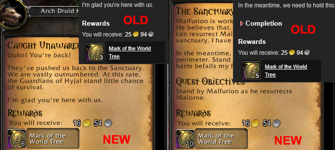 What ends up happening now is instead of ending up with 8 Marks of the World Tree when you get to the point of unlocking the “outside” dailies, you have 16. After doing a single set of dailies, you will end up with 4 more Marks, unlocking the Firelands portal after one more quest. At that point, you are a mere one elite mob away from unlocking our friend Zen’Vorka and his goodies for your alts. The entire process takes ~35 minutes from zero to epic 365s depending on the dailies you get stuck with.