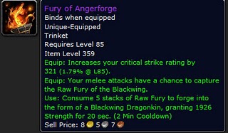 Fury of Angerforge though? It was not particularly cheap. Even if I did resell it, the margin would probably not be that great. You do not see very many BoE trinkets on Auchindoun though, which is a point in its favor. And my mortal weakness in WoW are things that change your character model and/or debris you can set up in the game world, as opposed to pets or mounts that other people fawn over.
