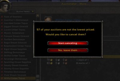 Props to Alto for being the one that pointed out the More tab in Auctionator last month that was staring me in the face for half a year without ever having clicked on it. Basically, click the More tab, press Check for Undercuts, wait a bit, and then spam-click Cancel Auction Track & Field-style. I used to get fancy with undercutting prices, but the gem market is sufficiently busy that you are liable to be undercut within a few hours no matter the price – it is faster to just let Auctionator undercut by the standard 10s anyway.