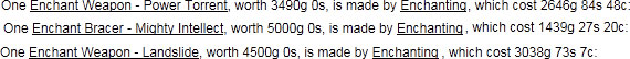 I am talking about big-ticket items like Landslide, Windwalker, and Power Torrent. I am also talking about things like the wrist enchants. The weapon enchant patterns take around 2000g to purchase with Maelstroms at 400g, which is a reasonably expensive barrier to entry, keeping competition low. But just because Maelstroms are 400g does not mean you have to price them accordingly. Landslide might not be going for 26,000g anymore, but a “reasonable” 6,000g is still a particularly ridiculous margin now that Maelstroms are low. This is a sweet-spot time in terms of high-end enchants, insofar that everyone knows Maelstroms are less valuable than before (although still nothing to scoff at) but before the greater server groupthink expects weapon enchants to be cheap.