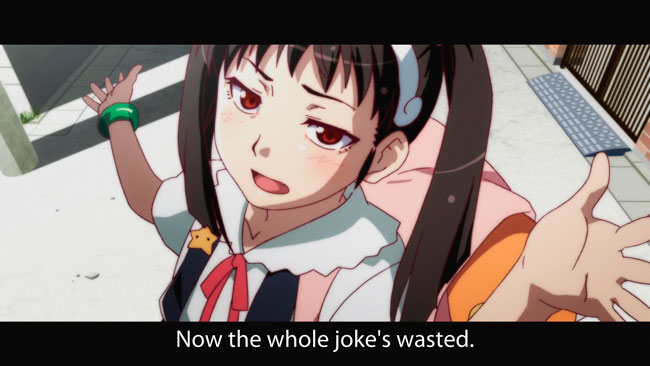 Although the show is definitely a comedy, the humor comes not from (just) slap-stick but from the dialog-dense exchanges between the main characters. There is a healthy dose of Japanese puns thrown in, but the anime absolutely had me in stitches quite a few times from the wordplay alone. The brilliance of Bakemonogatari comes through when you begin to realize that it is doing things and presenting scenarios which have never been seen in an anime before. For example, I will never look at a stapler the same way again.