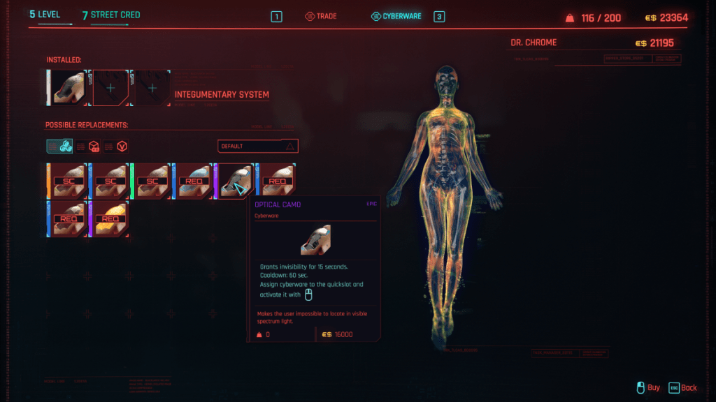 Know what else is disappointing? The cyberware parts of Cyberpunk. The game is predicated on body enhancements and everyone certainly looks the part. But the thing you find out after browsing a few Ripperdocs is that all the enhancements are… just random buffs locked behind Attribute gates. Sometimes you will find a common-tier upgrade not locked behind such a gate, but the vast majority are tied to your character’s Body or Reflexes Attribute, which means a Technical Ability/Intelligence character (cough) doesn’t have much to gain by cyberware. Which is really fucking bizarre, right? Compare that to how Deus Ex handles things – augments grant gameplay-changing abilities and are otherwise a big deal. In Cyberpunk, they are non-choices.