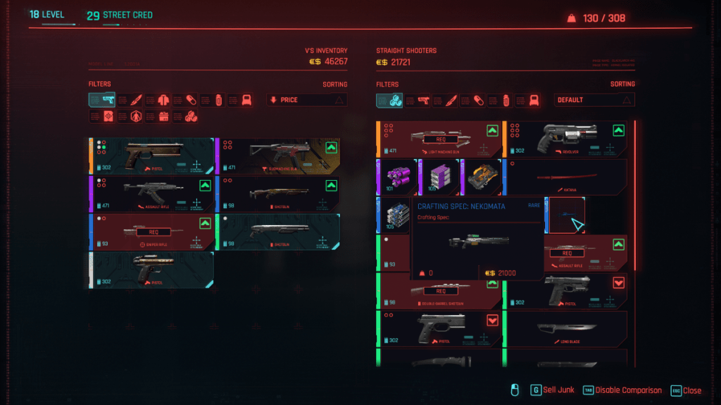 Aside from that, crafting largely sucks. You need to purchase weapon/armor “specs” from vendors to unlock the ability to craft that item in that specific tier. Just because you can craft a Rare sniper rifle does not mean you can craft the Epic version of the same sniper rifle, even if you unlocked Epic crafting via Perks. Also, the spec for that Sniper Rifle costs 75,000 credits which is just about what it costs to just purchase the Legendary version of that Sniper Rifle from the same vendor. At a certain point you can farm practically infinite amounts of credits via crafting anyway (purchase components, craft X gun, sell to vendor, cycle vendors), but the point is that the system as a whole makes no fucking sense. What was the harm with a more reasonable weapon spec cost? Woohoo, I get a “cheap” Epic Sniper Rifle by dumping Attribute and Perk Points into a tree that does not otherwise enhance my ability to deal damage with said Sniper Rifle. Christ, I bet that I would deal more damage with a trash-tier Sniper Rifle and those points spent in Reflexes instead.