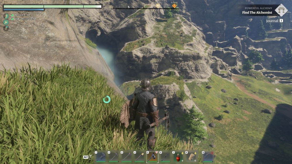 This is important to know because general movement in Enshrouded is crap. Encounter a steep hill? Sometimes you can jump and land on individual pixels and sometimes not. If you aim your pick awkwardly upwards you can sometimes dig out a little ledge to help you climb. Double-Jump is a talent you can spec into as well. Things you can’t do? Build a box and stand on it. Or use the Grappling Hook – that’s exclusively designed to hook onto metal rings in specific places. Later on, you can unlock giant towers that you can fast travel to the top of and then jump off and use a “glider” to get around. But the glider handles more like a wingsuit weighed down with tungsten anchors than anything else.