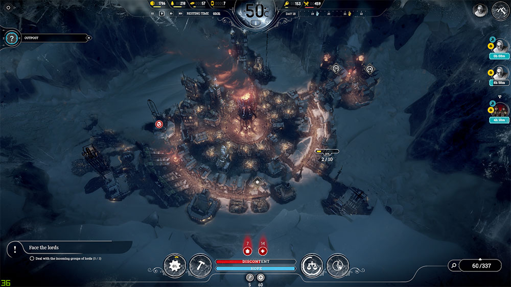 The premise of Frostpunk is that there is some global cataclysm in an alternate timeline Earth that makes the world freeze over. You are charged with keeping your citizens alive next to a coal-powered Generator as you face increasing environmental threats from the outside, and social unrest from the inside. While there is an Endless mode, the base game really revolves around Scenarios, which have defined escalation points (within a range) and endings.