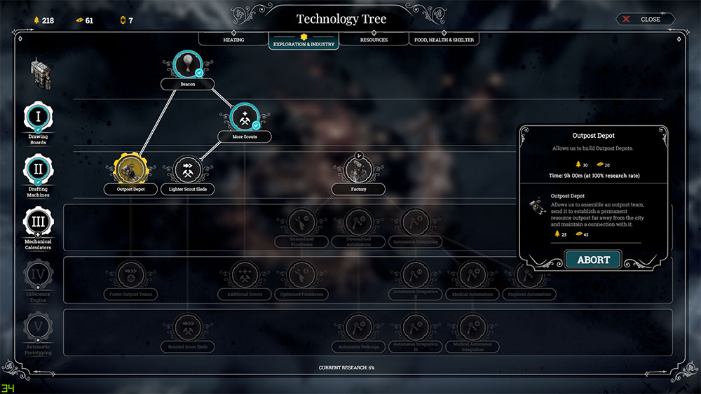 In this sense, Frostpunk is not a survival city-building game at all – it’s a puzzle game. Do A, then B, then C, then win. It is just a matter of figuring out what A, B, and C are. If you play Frostpunk like a steampunk Sim City, or an RTS without units, you will have a bad time. It is way too easy to get infinite resources, which is “balanced” by the fact that the game only lasts X amount of days for each Scenario. Which is fine, I guess. But why dress it up in such a slick package, including having five tiers in the tech tree, as if any of that matters?