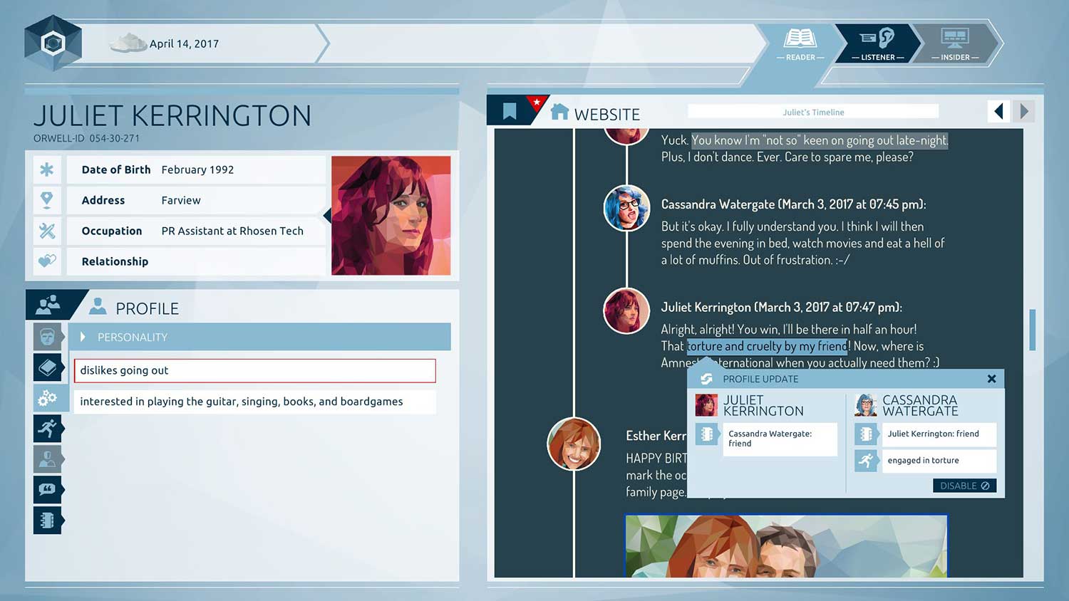 I just completed Orwell, a sort of Papers, Please-style game that demonstrates the dangers of mass surveillance. As an Investigator, your job is to comb through a few suspects’ Facebook pages, text threads, and anything else you can get your hands on (including medical records) to glean info and connect dots to stop further terrorist attacks.