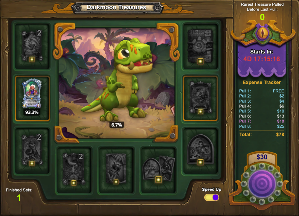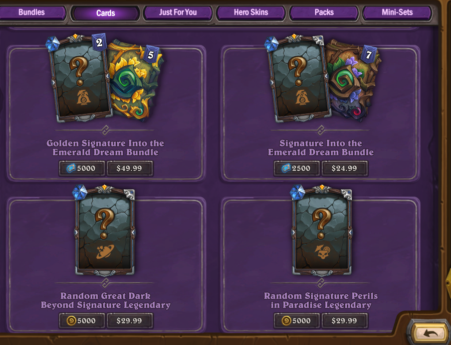 Plus, if I were feeling onery, I would point out that technically the pet only costs $158 if you value the remaining items at zero. Signature Legendary cards in the shop are sold for $30 as seen above. Hero portraits are usually $10 apiece and there are two. It’s hard to value a Diamond Legendary since you only get those in special ways, but I think I’ve seen them go for $40-$50. A single Golden pack costs $4. I’m not going to speculate on the other Signature cards or the card back, but already we’re back down to $54 taking the other stuff into account.