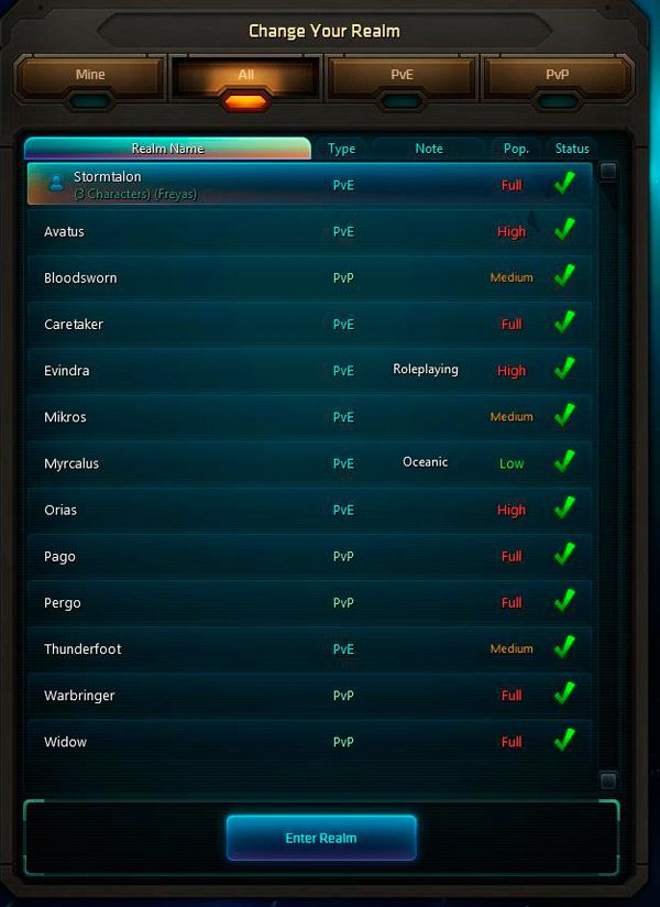 In fact, there were some issues right from the start: one of the friends is gung-ho for PvP servers and already rolled on Warbringer as Dominion, then tagged us all in a Facebook post to let us know. There’s little doubt that if I went with him, most everyone else would follow. So, do I try and keep everyone together? Or do I herd as many friends as possible to a PvE server where the likely 1-month survivors will have more fun? Once that (easy) decision was made, I had to, you know, pick a PvE server. Obviously the Full ones were out, but should I go High or Medium? What is the server known for? And what kind of question is that, on Day 1 of the Head-Start?