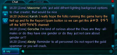 First, in perhaps the most comical bug fail I’ve ever seen, clicking the Report as Spammer button on any of the numerous gold sellers in chat results in an instant Crash-2-Desktop. The spam cleared up by itself once out of the starter zones, but I’m still laughing at the implicit message being sent.