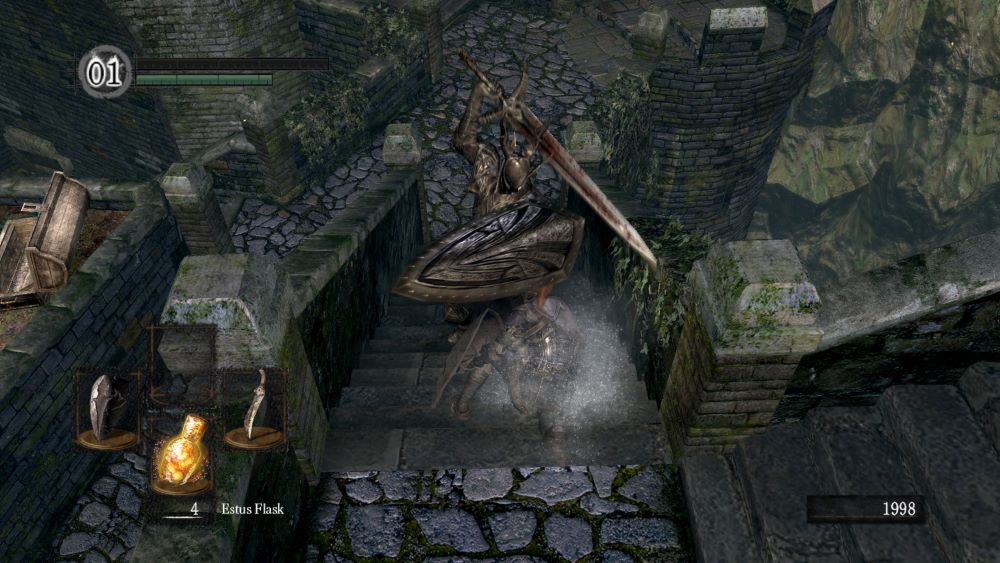 From the Blacksmith, I try and remember if there was a shortcut to the Undead Burg. Heading lower, I encounter a crippled statue thing that shoots lightning. I hit it once or twice, note how my power attack deals 15 damage, and then just run around it and down the hallway beyond. Kill some plant creatures. Walk to a vista area, look around for a moment, note “there doesn’t seem to be many mobs around here,” and instinctively turn around and parry the blow from another plant creature coming up behind me. Pretty sure getting hit where I was would have sent me flying over the cliff.