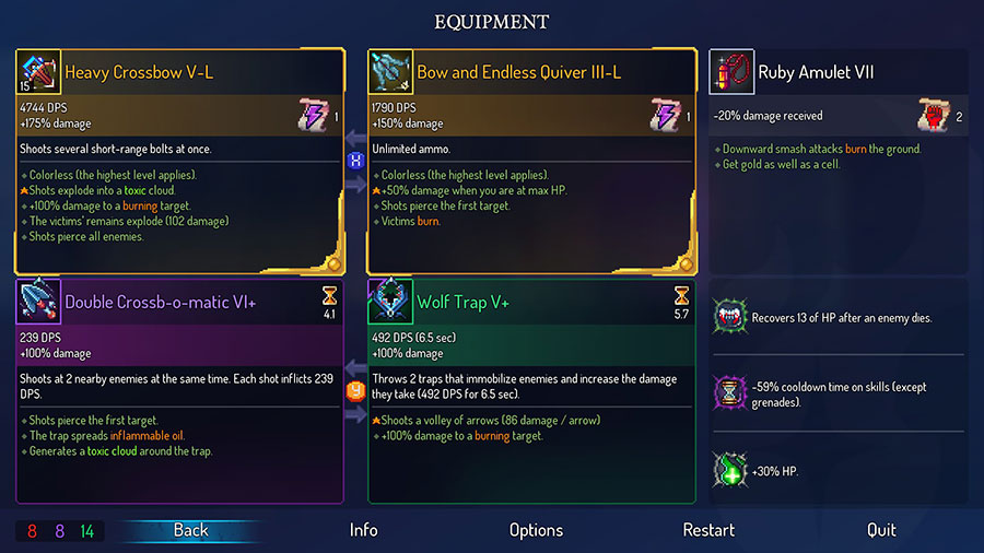 Of course, that’s how roguelikes work. It’s expected that you start over a bunch of times. And in this regard, I definitely felt less terrible after a death in Dead Cells than I did in Hollow Knight.