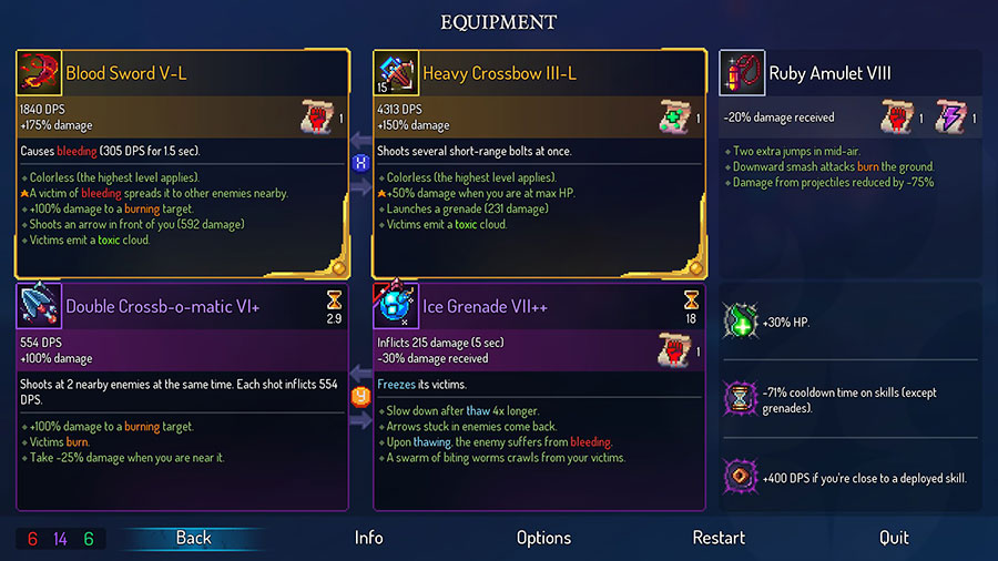 Dead Cells is basically a roguelike Metroidvania that has more in common with Rogue Legacy and Binding of Isaac than, say, Hollow Knight. Defeating enemies occasionally gives you a currency (Cells) that you can spend at the end of each level to unlock permanent upgrades and blueprints of items that are then seeded into the item pool of future runs. Of course, that assumes you make it to the end of the level – die before then, and you lose everything you were carrying, and have to start over at the beginning of the game.