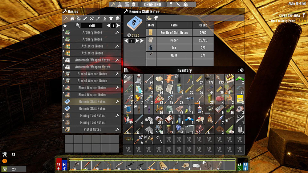 I have mentioned it before, but 7 Days to Die (7DTD) is a game that somehow pushes all the right buttons for me. It has zombies, crafting, loot progression, skill points and XP, base building, a sort of tower defense angle (during the 7th day Blood moon), resource gathering, scavenging post-apocalypse buildings, and so on. A lot of those mechanics synergize with each other in interesting ways too. For example, you have to weigh the costs/benefits of clearing buildings of supplies versus mining for resources to build out your base to survive the Blood moon every 7 days. And knowing that a horde of strong zombies will be able to hone in on your position on a regular schedule gives meaning and structure around your day-to-day decisions.
