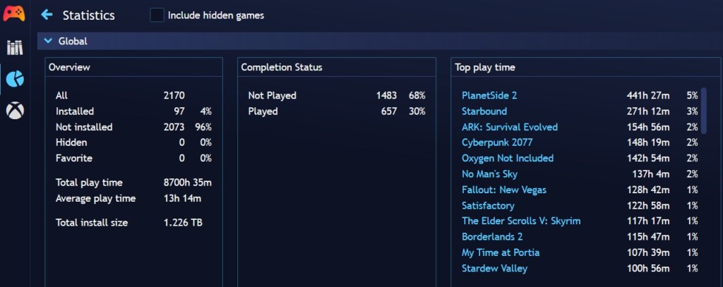 Yes… and no. Out of the box, Playnite will display every Xbox Game Pass game you have ever played before, even if it is no longer on the service. Very annoying. There is an add-on you can install though, to create a separate button to browse the currently available Game Pass games (under Generic: “Game Pass Catalog Browser”). Additionally, there is still some oddness with Steam, insofar as the 449 hours /played of 7 Days to Die is not registering, which kind of calls into question the validity of any of the other stats. But, at least it’s something.