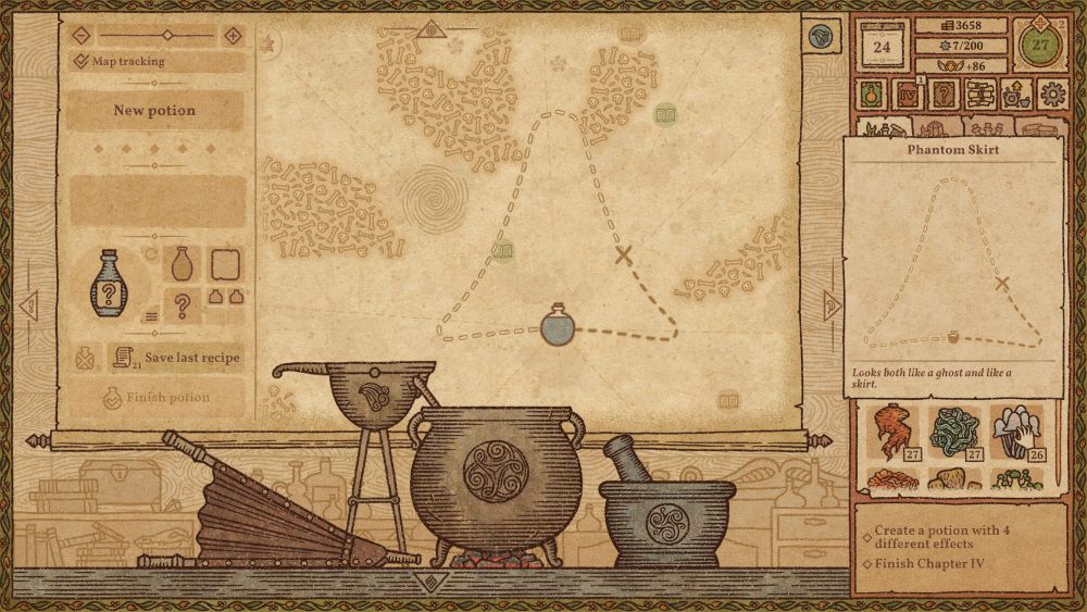 To craft a potion, you must move a potion icon around a map and land on a specific, potion-shaped effect. To move around the map requires you to place an ingredient into the caldron and stir. At the beginning, you start off with a limited amount of basic herbs and mushrooms. Hovering over each one reveals the properties of that ingredient, showing you where it will move the potion icon. What you will notice is that there is a sort of baseline distance you move, and then a further distance denoted by a dotted line. If that extra distance is desired, you must place the ingredient into a mortar and then pestle it as desired. Put the resulting mash into the caldron, stir, and repeat until you reach your destination.