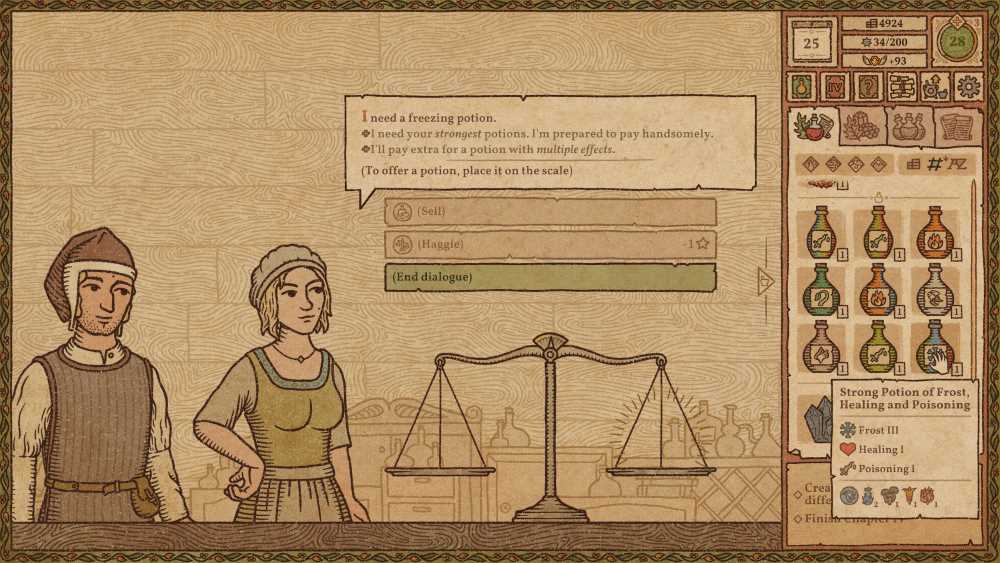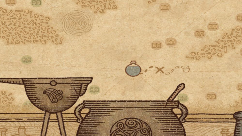 Everything about this is so deliciously analog. When using the mortar & pestle, you do not have to grind things up fully – you can choose to stop at almost any pixel distance. Additionally, the quality tier of the potion is dependent on how close you end up overlaying the potion icons. Just touching? Tier 1. More than half? Tier 2. If you want Tier 3 though, you start slowing way down, grinding herbs just so, stirring the caldron ever-so-slightly, and diluting the mixture with water (which moves the icon back towards the center of the map) drop by drop. Until, until… ahh. Perfection.