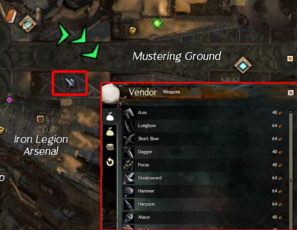 The significance of these vendors is that you can buy every weapon type from them. While the weapons themselves are of low-quality, and expensive for low-level characters anyway, the point is that it is entirely possible to never run across, say, a pair of pistols on your Thief or a Longbow for your Ranger. Not only can you miss the opportunity to level up those weapon skills until you manage to get a random drop, but some classes are worlds more fun with certain weapons – you have not played a Guardian until you played a Guardian with a Broadsword, or an Elementalist with dual-daggers. So if you find yourself creeping up on 2 whole silver pieces and have not unlocked the majority of your weapon skills, I suggest making a shopping trip in town.