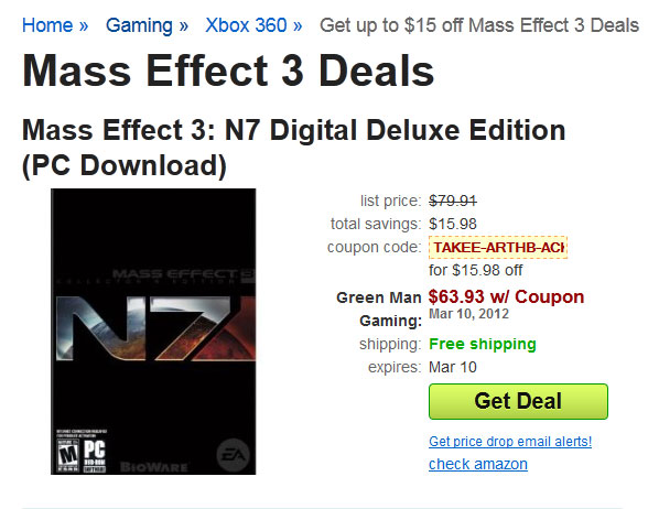 If you will recall, I ended up paying ~$85 for Mass Effect 3: Digital Deluxe Edition about two days ago. Had I waited those two days, I could have spent $16 somewhere, anywhere else. I am not in a financial situation in which the $16 necessarily matters, but it matters to me that I essentially paid an Enthusiasm Tax.