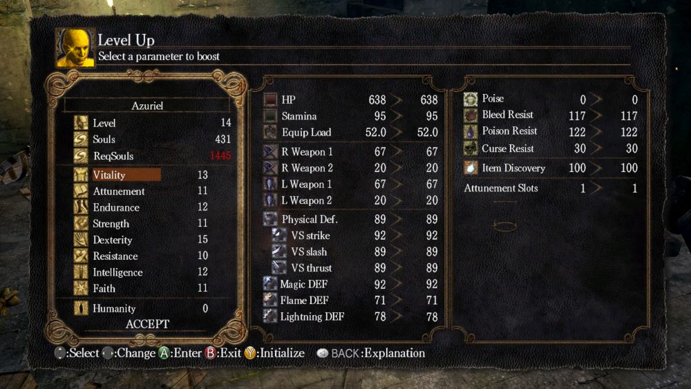 Made it to the second Bonfire after clearing out some Hollow mobs in a new area. Resting/saving your game respawns all enemies, which is intended to create some Press-Your-Luck tension. Which it would… once I’m done farming this infinite pile of respawning Souls steps away from a Save Point. I’m going to assume that gaining five levels this way isn’t going to bite me in the ass later. While farming, I end up getting two “liquid” Humanity (as opposed to the “solid” items), which is a resource that goes away when you die. So, I spent one Humanity to turn into a Human, and then another to Kindle the Bonfire, which grants me more health potion uses for this area. Again, I’m assuming this won’t set me back permanently somehow.