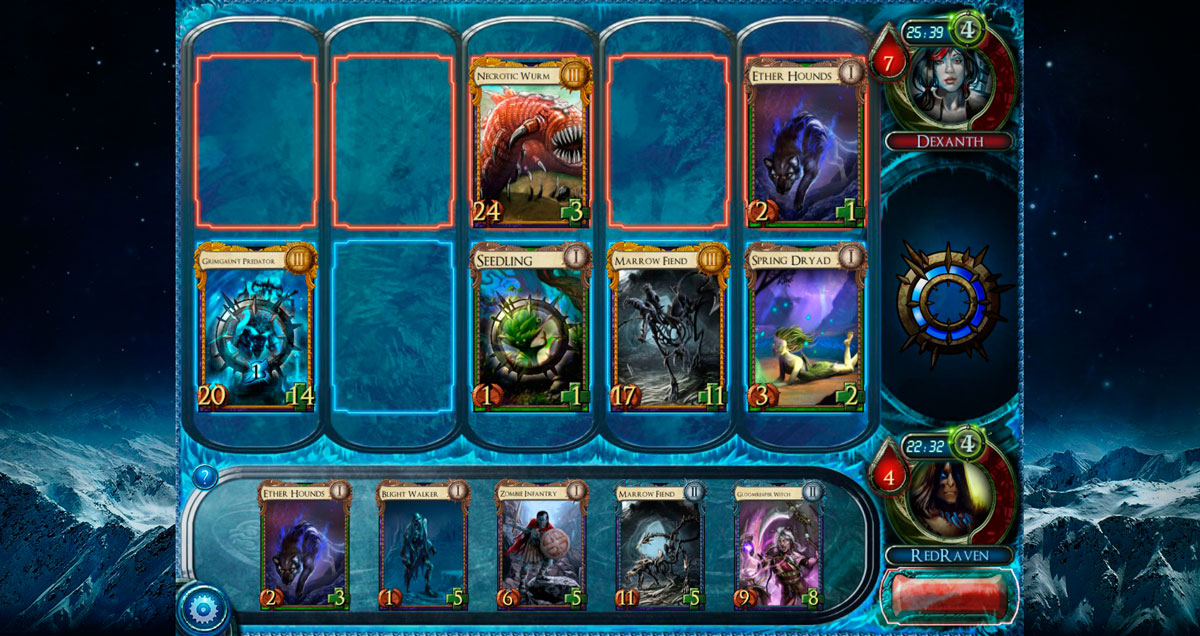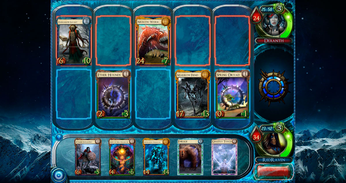 It is my opponent’s turn, late in the endgame. His creatures are the 6/10 Savant that let’s him give a creature -3/-3 whenever he casts a Level 1 spell, and “just” a 24/7 wurm. Mine are all just vanilla creatures aside from the Dryad, which gets +1/+1 each time a creature comes into play on my side. He just cast the +3 Attack/-3 Attack spell I mentioned earlier, targeting his wurm and my dryad, taking out one of my 2/3 Ether Hounds with the -3/-3 trigger. He then plays his own Ether Hounds, providing blockers for my Dryad and Marrow Fiend, using the Savant’s trigger to kill my last Ether Hound. He attacks, creatures die, and we go down to 7 and 4 HP respectfully.