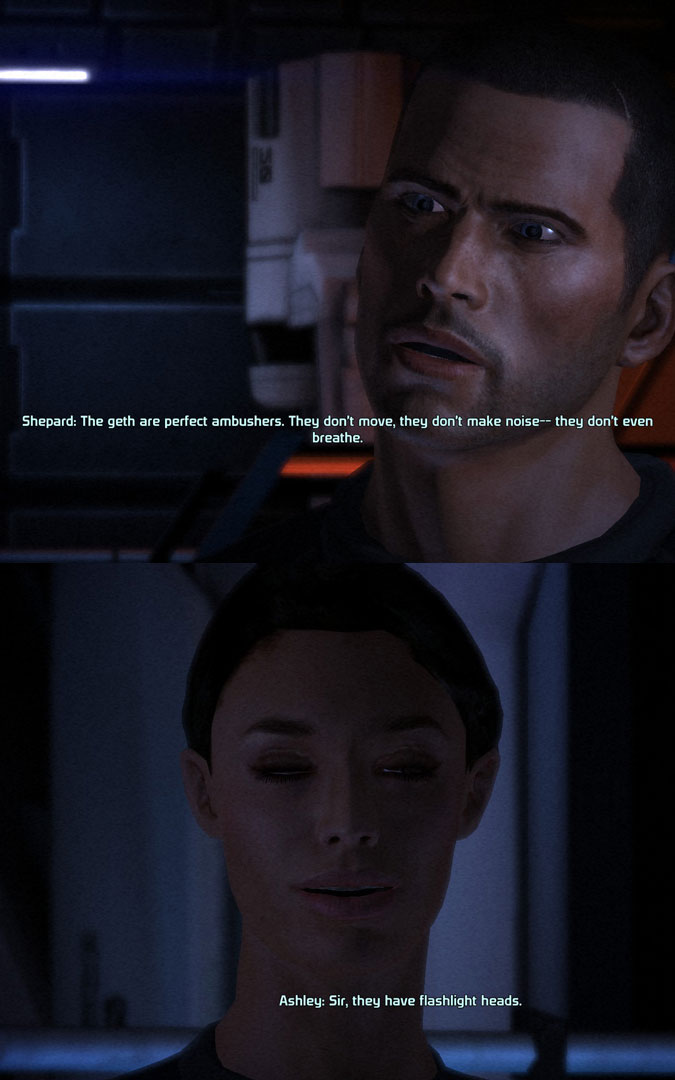 What really ended up surprising me was when what originally appeared to be a simple “alien + personality quirk” party member, suddenly unfolded into a paper crane of origami complexity. I am specifically talking about Mordin, whom I felt practically stole the show aboard the Normandy. The transition between him being a “stereotypical” Salarian with a humorous ADHD staccato manner of speaking, to a weary doctor haunted by the ethical ghosts of his past is nothing short of brilliant. In fact, it is not even really a transition of his character, but a transition of your perception of his character; he didn’t become deeper, you merely discovered the depths. While the other characters are perhaps less complex in comparison, that is practically true of most characters in any RPG that I can recall.