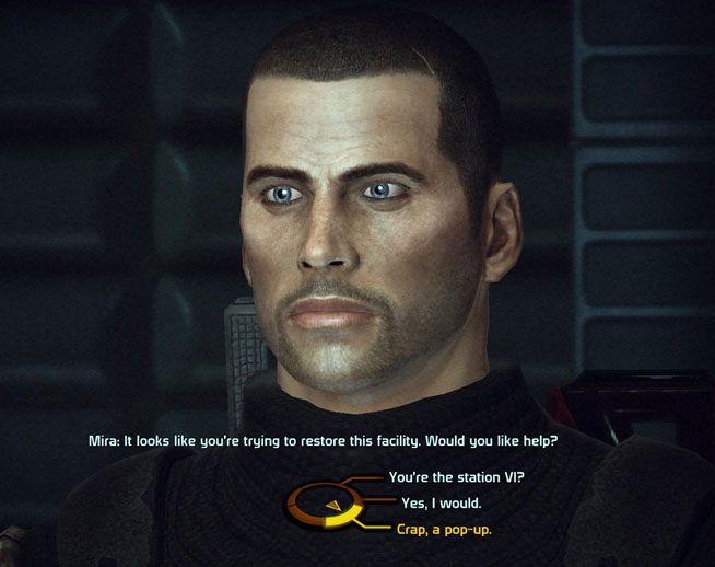 My favorite aspect of the original Mass Effect was the integration of non-verbal dialog into the narrative, and the general narrative itself. In ME2, that is kicked up a notch^². Characters smile, nod, gesture, facepalm, wink, and otherwise emote in subtle, natural ways. Indeed, these little actions end up becoming part of the dialog, creating nuance and meaning that words themselves could not convey. Some scenes are punctuated with Quick Time Event-esque moves, such as interrupting a bad guy speech by just shooting him, or stopping someone from doing something they will later regret. While QTEs are normally cheap, annoying gimmicks to force players to pay attention, the ones in ME2 felt a natural part of the narrative… including when you went ahead and let a teammate squeeze off a round in the criminal’s kneecap. I have not played a proper RPG since starting up this Mass Effect experiment, and I am still nervous about whether I could ever go back to static character portraits, scrolling text, or (well-done) narrative QTEs again.