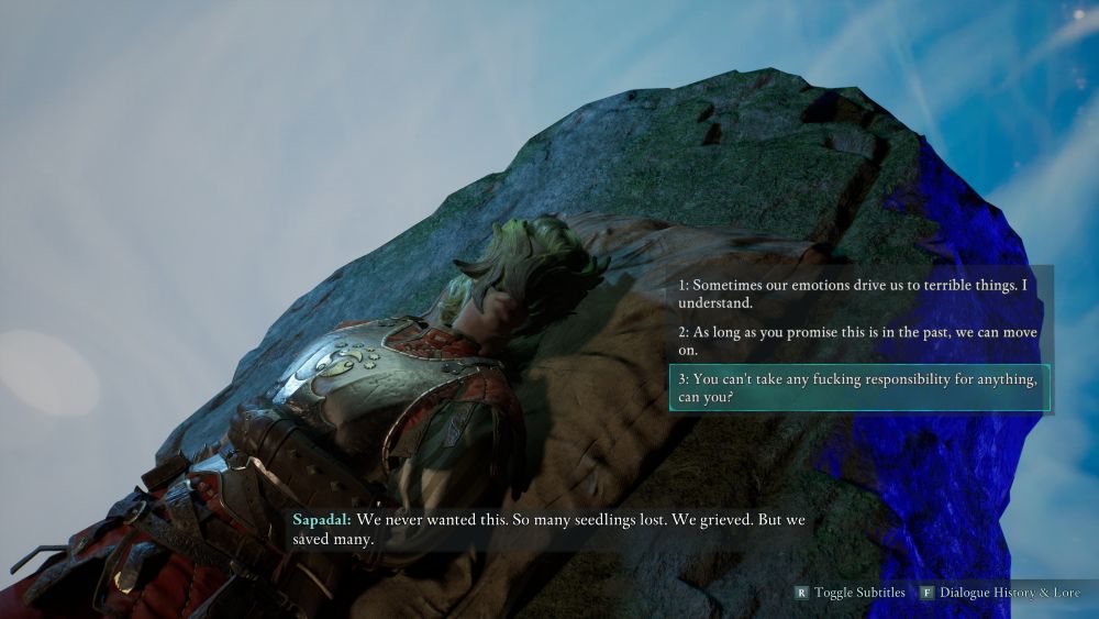 This is not the first place Avowed leaned so far into “roleplay” that it fell directly into RPG mad libs. There are frequent dream sequences throughout the game where you are asked to choose how events in the past played out. Some of these choices lead to you getting one godlike ability versus another, but the majority of it is just… there. I understand that there are (presumably) people who like this sort of thing, but Avowed just sort of drops it on your porch and leaves. There’s no context, no sense of purpose. Again, what’s my motivation? Am I training somebody to be more forgiving or spiteful, depending on my dream answers? Or am I literally playing one-person mad libs?